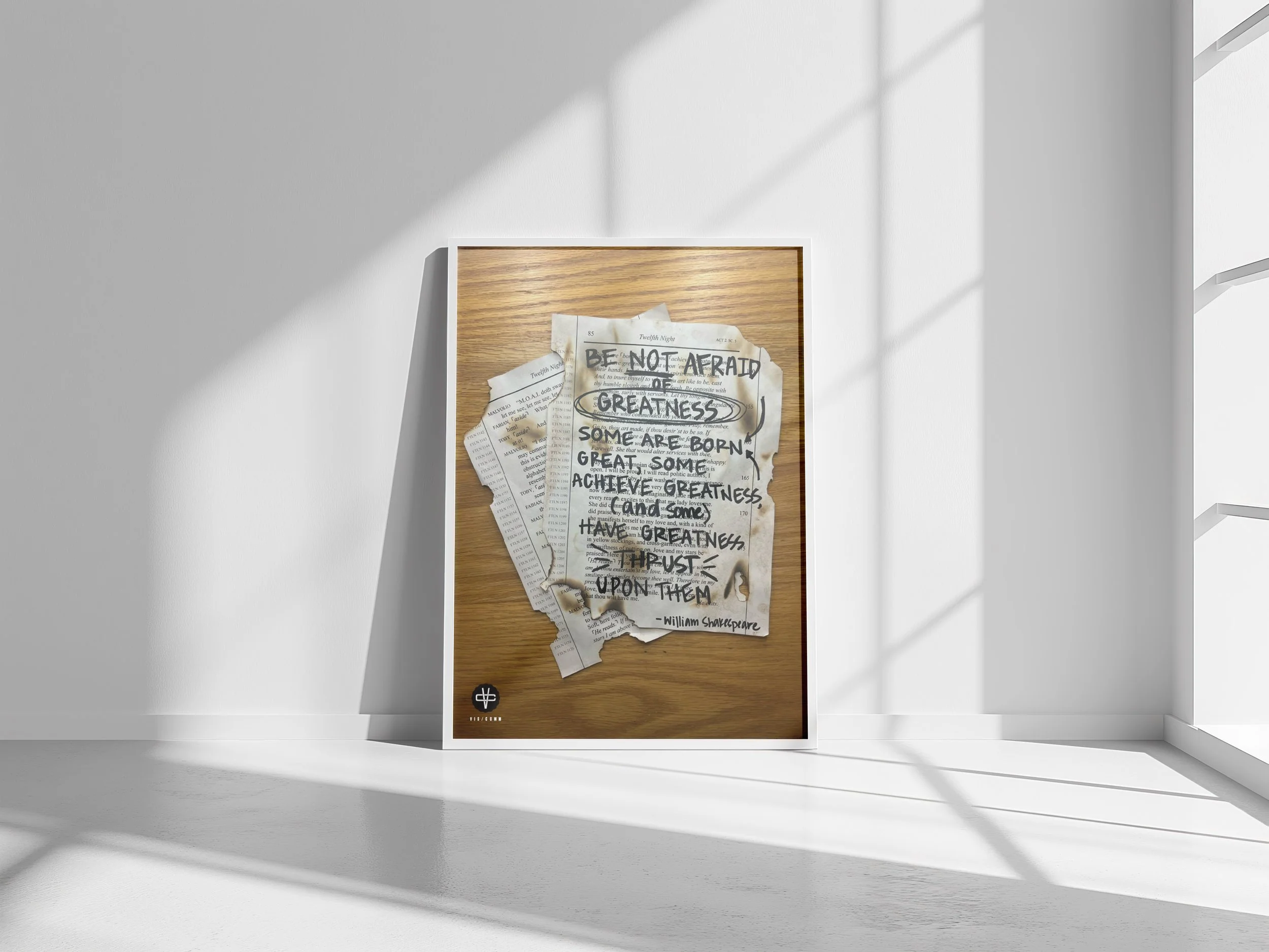 For this project, I created a typographic poster based on a Shakespeare quote, focusing on exploring the emotion of the text through primarily non-digital typography. Instead of just placing the quote into a clean layout, I physically wrote it onto distressed, burnt pages from the script the line comes from. I wanted the material itself to reflect the drama and intensity of Shakespeare’s language, so the faded paper and scorched edges help communicate that feeling visually. By combining hand-rendered type with manipulated script pages, I was able to turn the quote into something more immersive and expressive, letting the texture and physical process add meaning to the words.